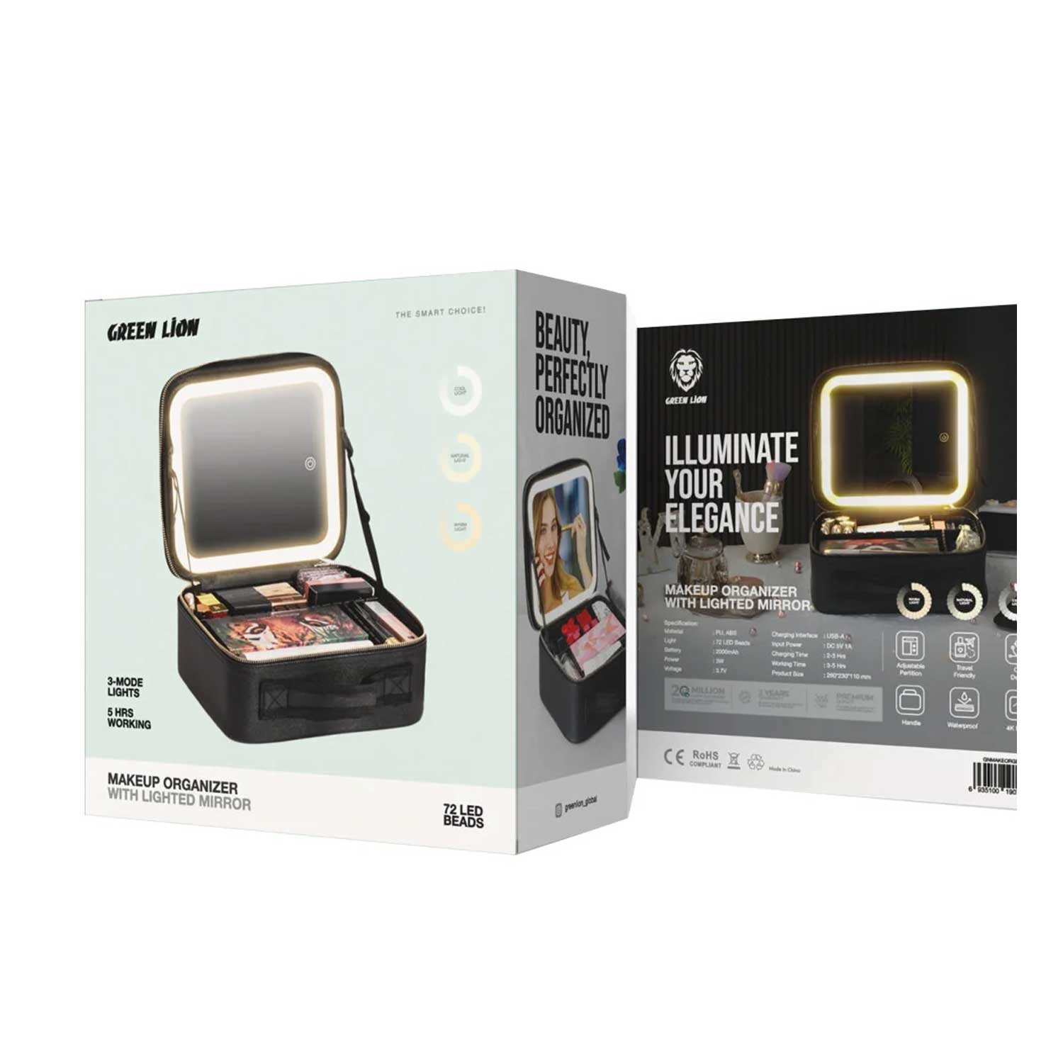 The Green Lion Makeup Organizer is fashionable, practical, and crafted to meet all your beauty needs. Featuring a stunning 4K mirror with 72 LED beads, this organizer delivers perfect lighting for flawless makeup application. It comes with a 2000mAh rechargeable battery powered via USB-A, providing long-lasting convenience whether you're at home or travelling. Its adjustable partition allows you to customize the interior layout, while the waterproof design and sturdy handle make it an ideal travel companion.